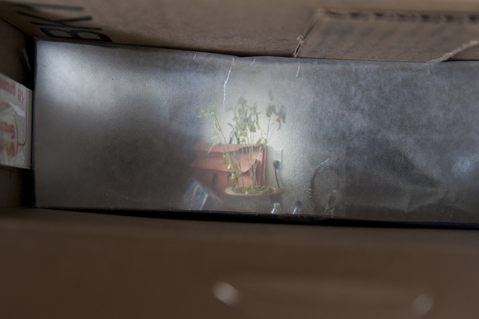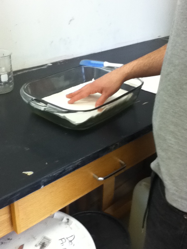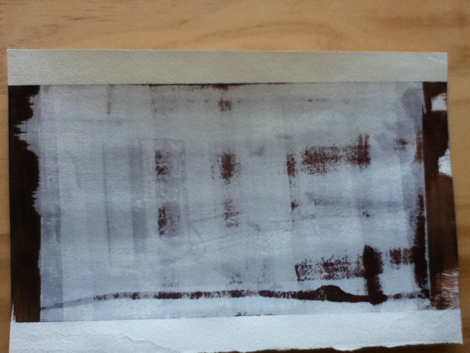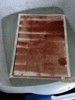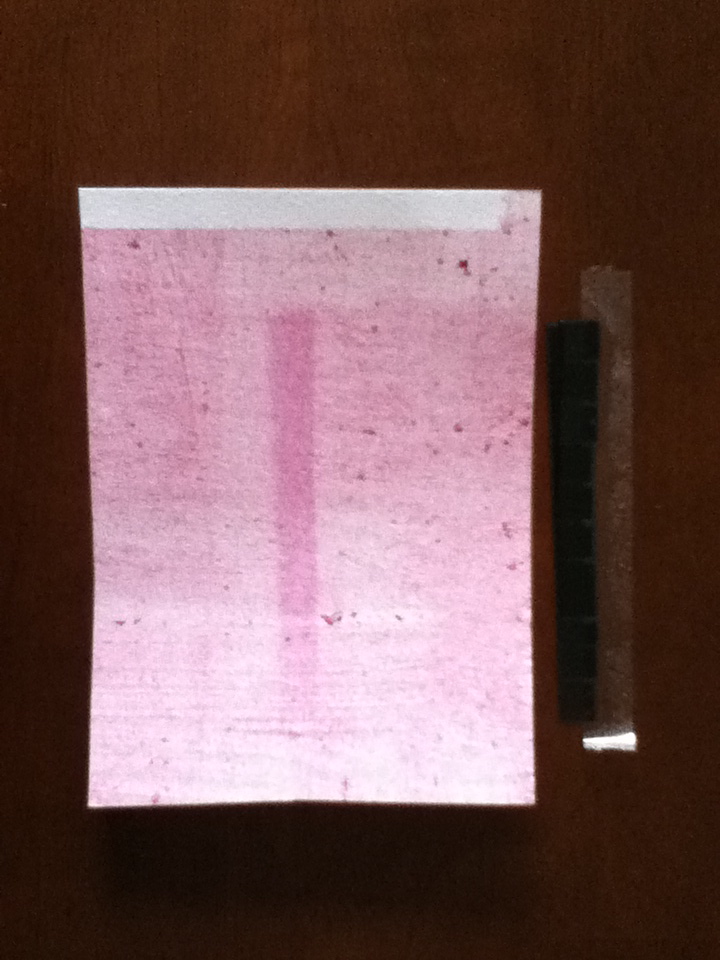 The papers were placed in a water wash, two sodium thiosulphate (hypo) baths, and then a final water wash to fix the images. The images became a yellowish brown and slightly lightened once under the hypo. The color cellophane and Peter’s objects were the only papers exposed under glass and it was interesting to find that they turned out darker than the other three that were exposed with no glass.
